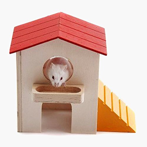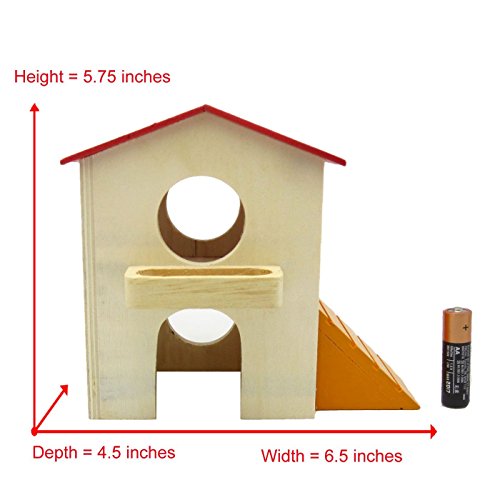 Ideal for hamster, mouse and other small furry animals. This small animal hideout measures 6.5" in width, 4.5" in depth and 5.75" in height. Its entrance hole measures 2.25'' x 1.6''. There are six windows each 1.6" in diameter.