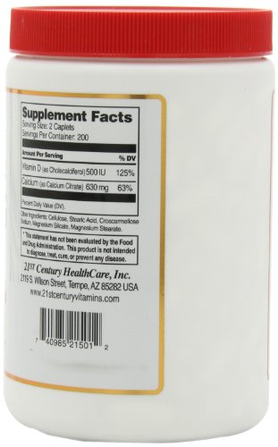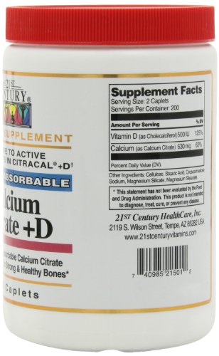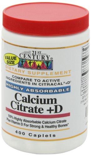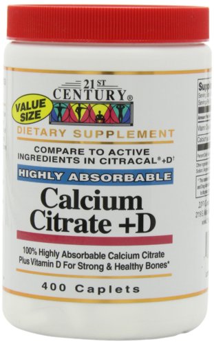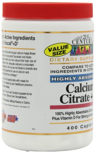 -. Binding : Health and Beauty -. Brand : 21st Century -. EAN : 0740985215012 -. Feature : Pack of three, 400-capsules per pack (total of 1200-capsules) / 100 percent highly absorbable calcium citrate plus vitamin D for strong and healthy bones -. Label : 21st Century -. Manufacturer : 21st Century -. NumberOfItems : 3 -. PackageQuantity : 3 -. ProductGroup : Health and Beauty -. ProductTypeName : HEALTH_PERSONAL_CARE -. Publisher : 21st Century -. Studio : 21st Century -. Title : 21st Century Dietary Supplement Calcium Citrate + D, Value Size , 400 caplets (Pack of 3) -. UPC : 740985215012