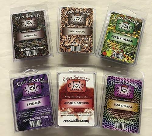 6 Pack Soy Wickless Candle Tart Wax Bar Melts - Herbal Pack - Includes one 6 cube pack of each of Lavender, Cedar and Saffron, Sandalwood, Purely Herbal, Patchouli, and Nag Champa