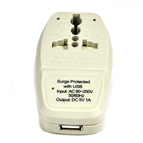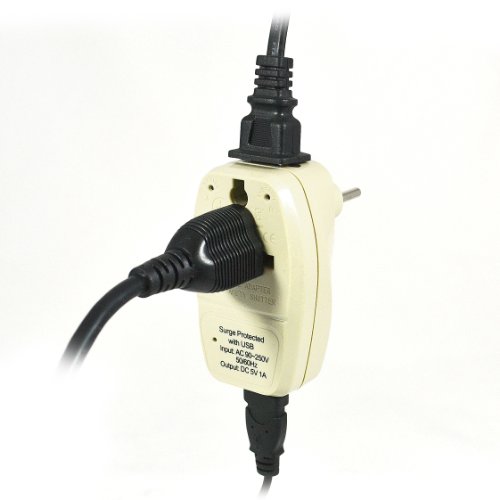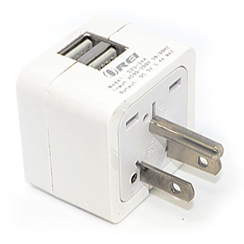 Designed with double ports (receptacles) allow you to plug-in two electrical devices (connectors) at once (Does not Convert Voltage) + USB Input Surge Protection with Smart LED Input Voltage Indicator (110V or 220V) - Protect your high end electronics from harmful voltage surges Output: Type B Suitable for USA, Japan and More Recharge your USB devices (Cameras, Cell Phones, PDA, MP3 Players, GPS devices and much more) in your Home, Office, Hotel, etc. USB LED light indicates charging status - Fully Charged: Green Light, Charging: Red Light, USB: MAX 1A US Patented Universal Input: Accepts plugs from all countries (except the Type M - big S Africa 87mm Plug) Safety Shutters.Feature