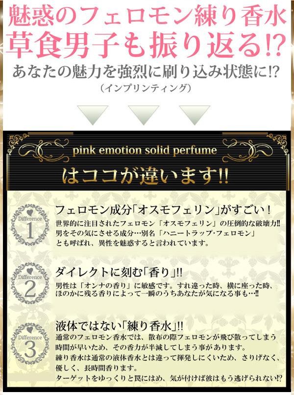 人気のチェリーブロッサムの香りに、別名「ハニートラップ・フェロモン」とも呼ばれるフェロモン成分、「オスモフェリン」をプラス。通常の液体香水と違って揮発しにくい為、長時間優しく、さりげなく香ります。 |