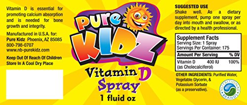-. Feature : Liquid vitamin D spray from Pure Kidz delivers 400 IU of vitamin D3 per spray / Vitamin D is especially important for growth and development of bones and teeth in children, regulates the growth and activity of cells and reduces inflammation / Our kids D3 Spray tastes great with no artificial colors or sweeteners added; does not any dairy, egg, sugar, corn, yeast, wheat, soy, or gluten / Each 1 oz spray bottle of liquid Vitamin D for kids contains 175 sprays; each spray delivers 400 IU of vitamin D3 / Vitamin D sprays are known to be more effective in activating the saliva glands than vitamin d drops capsules, pills, or lozenges