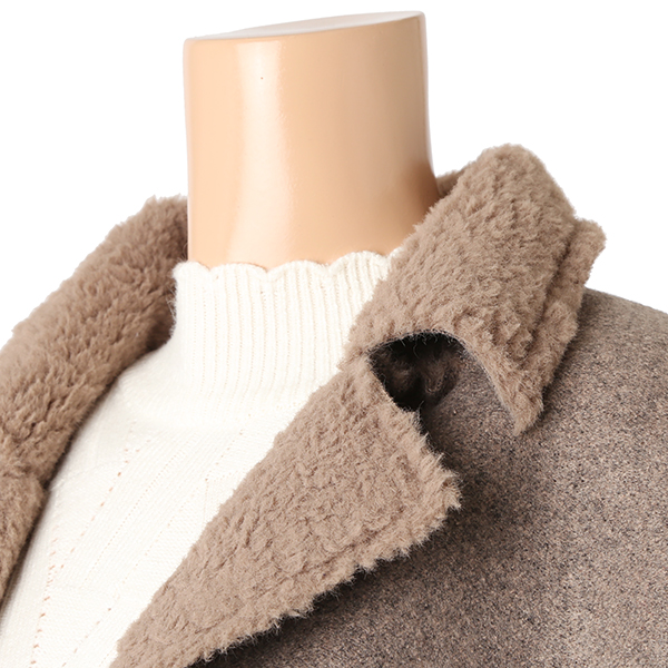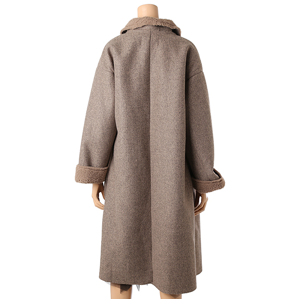 안감의 따뜻한 퍼가 포근한 루즈핏의 무스탕 롱 코트입니다.