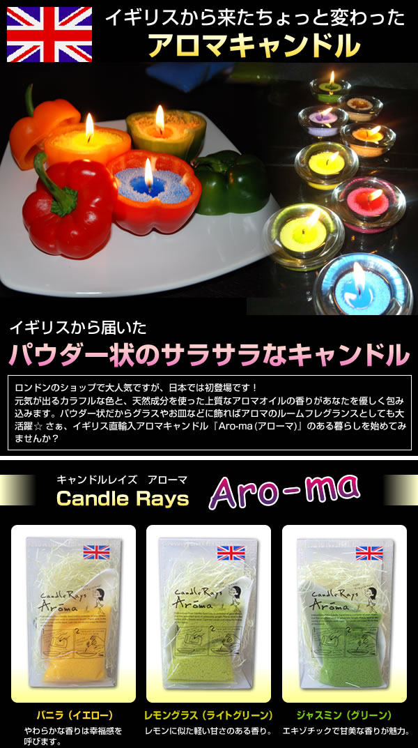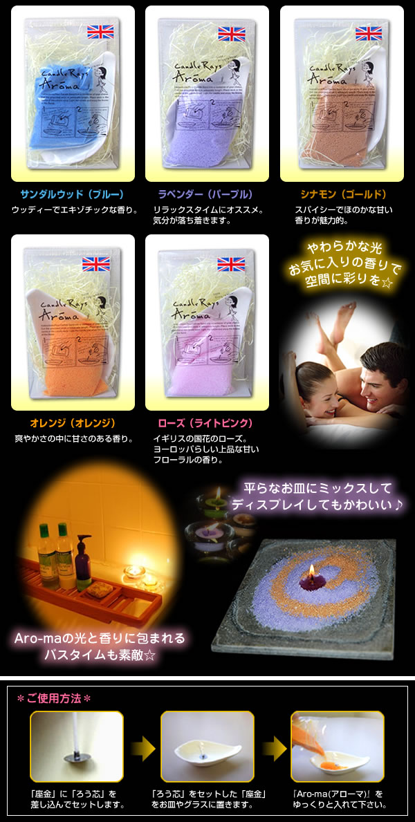 | イギリス生まれの不思議なアロマキャンドル☆なんとサラサラのパウダー状なんです!キャンドルとして、またお皿にのせて芳香剤としても楽しめます。やさしい光といい香りで幸せ気分♪ |