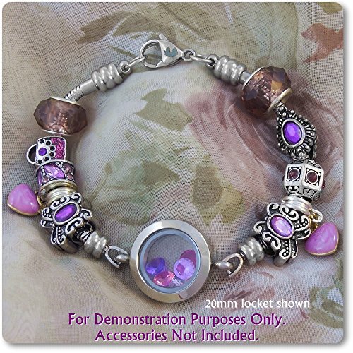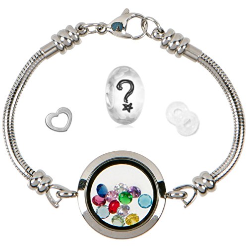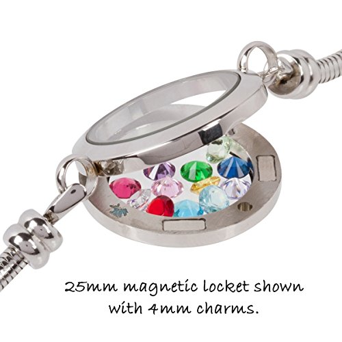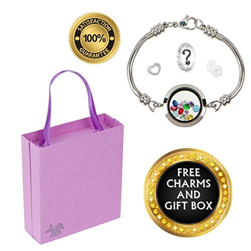 FREE CHARMS AND BOX - GIFTS YOU WILL LOVE! Includes locket bracelet, adorable and unique purse style gift box, set of 12 4mm glass birthstones floating charms, surgical steel hollow heart charm, two silicone rubber safety stopper rings, bonus lampwork glass Murano charm, and manufacturer warranty card with every order, ready for immediate giving.