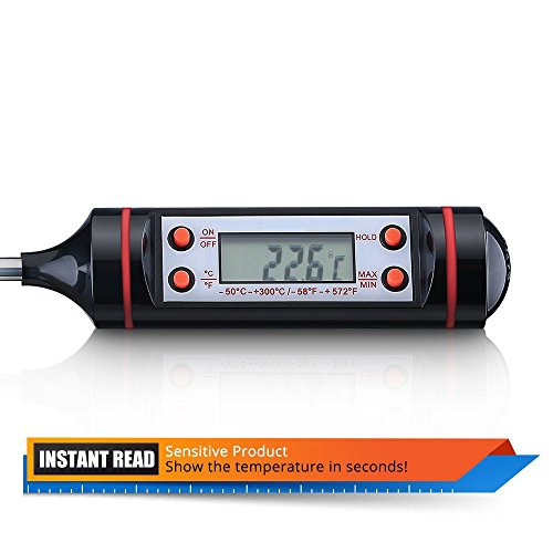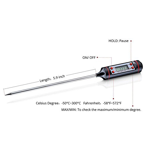 -. Feature : Quick and Accurate Read: LCD display shows accurate temperature results in seconds. / Auto Shutdown : Automatically shuts off after 10 minutes.(Battery Included) / Wide Temperature Range : Temperature measurement range of -50oC (-58°F) to 300°C (572o F). / Long Probe : 5.9inch long probe keeps you from burning your hands while measuring. / High Quality : Made of high quality 304 stainless steel and protected by a silicone cap, this thermometer is perfect for indoor or outdoor use.