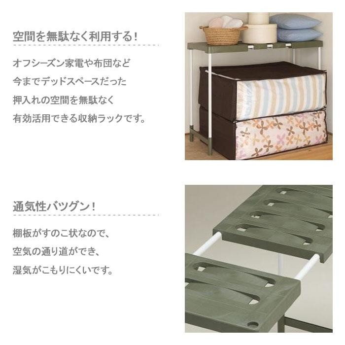棚板が「すのこ」状で通気性バツグンな『押入れフリーラック ハイタイプ』。オフシーズン家電やスーツケースの上などのデッドスペースを有効利用できます。 |