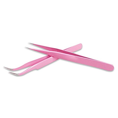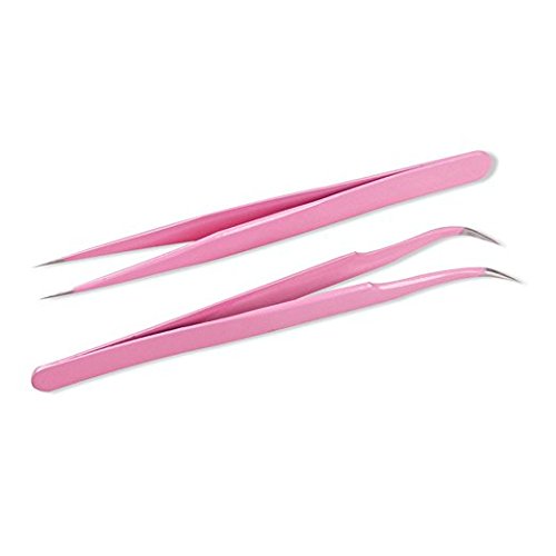2 PCS Stainless Steel Tweezers for Eyelash Extensions, Straight and Curved Tip Tweezers Nippers, False Lash Application Tools, Pink