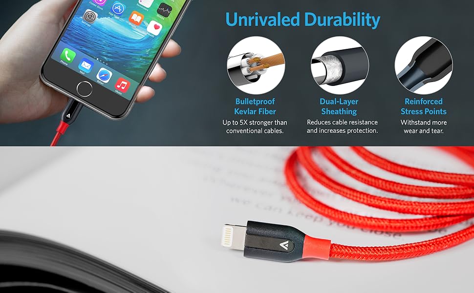 PowerLine+ Lightning The Premium Heavy-Duty Charging Cable From ANKER, America's Leading USB Charging Brand • Faster and safer charging with our advanced technology • 10 million+ happy users and counting Unrivaled Durability PowerLine+ may be the last cable you'll ever need. Proven to last at least 6 times as long as other cables, it boasts a bend tolerance 6 times higher. There's simply no other cable with this level of durability. End-to-End Strength Exceptional tensile strength is provided by a kevlar fiber core, double nylon-braiding and precision laser welding. PowerLine+ is built to withstand any yanking, twisting, stretching, or dropping that it might possibly be subjected to. Customized Cable Length An innovative felt carry pouch allows you to adjust cable length to suit any situation. Charging close to the wall? Wind up PowerLine+ inside the pouch to avoid cables trailing across the floor. MFi Certified PowerLine+ Lightning is certified safe by Apple themselves. This means it can be used with any and all of your Apple devices with total peace of mind. Compatible With: iPhone 7 / 7 Plus / iPhone 6s / 6s Plus / 6 / 6 Plus / 5s / 5c / 5, iPad Air / Air 2, iPad mini / mini 2 / mini 3 / mini 4, iPad (4th generation), iPod nano (7th generation) and iPod touch (5th generation).