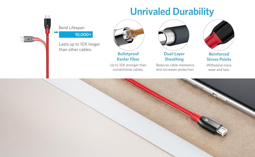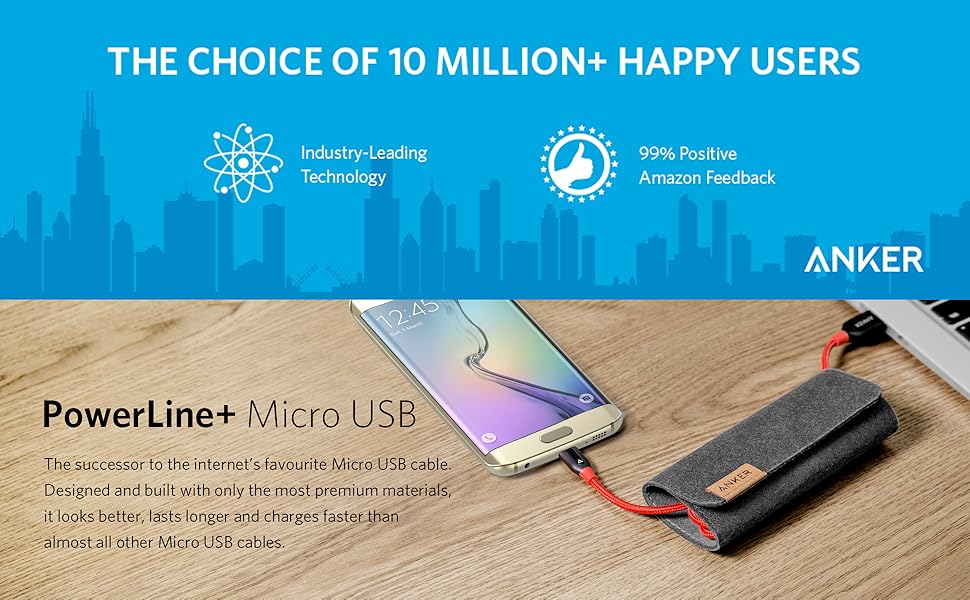 PowerLine+ Micro USB The Premium Heavy-Duty Charging Cable From ANKER, America's Leading USB Charging Brand • Faster and safer charging with our advanced technology • 10 million+ happy users and counting Unrivaled Durability PowerLine+ is the last cable you'll ever need. Proven to last at least 5 times as long as other cables and boasts a bend tolerance 10 times higher! There's simply no other cable with this level of durability. End-to-End Strength Exceptional tensile strength is provided by a kevlar fiber core, double nylon-braiding and precision laser welding. PowerLine+ is built to withstand any yanking, twisting, stretching, or dropping that it might possibly be subjected to. Customise Cable Length Includes an innovative felt pouch which allows you to adjust cable length for any situation. Close to your wall charger? Wind up PowerLine+ inside the pouch to avoid cables trailing across the floor. High-Speed Charging Low quality charging cables can reduce charging speeds by over 40%. PowerLine+ is designed with a thick wire gauge which reduces resistance and ensures maximum charging speed.