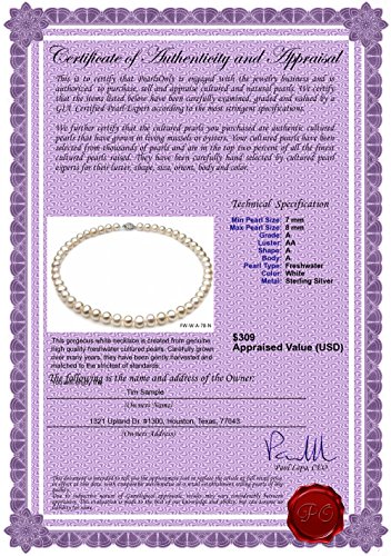 Included FREE with your cultured pearls necklace is an Appraisal Certificate prepared by a Pearl Expert describing in detail your necklace size, color and body shape. A color picture of your necklace is shown on each certificate to ensure carefree insurance claims should those ever arise. It is a wonderful keepsake that shows you truly care.