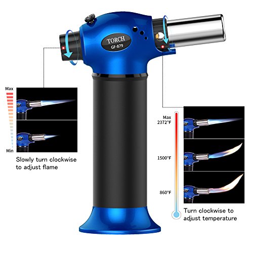 ❤EASY TO REFILL:You can refill torch with butane yourself, Just turn the torch upside down, then refill the gas by the gas refill valve and fill it in about 10 seconds. Refill butane is sold on Amazon or at most Supermarkets. Be sure it includes the long nozzles for application.