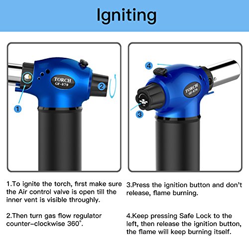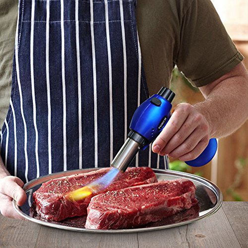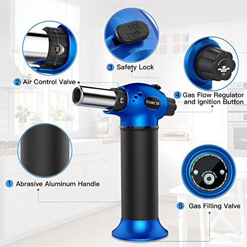 ❤EASY TO USE:Our kitchen torch built with piezo ignition. Just press the ignition button to ignite and it will keep burning automatically if you push the safety lock to the left, enabling you to operate it with one hand. With the full gas, the flame can keep burning for 60 mins. You can prepare a feast for the family, or even for a party! The pretty design will not only light up your food, but also dress up your kitchen.