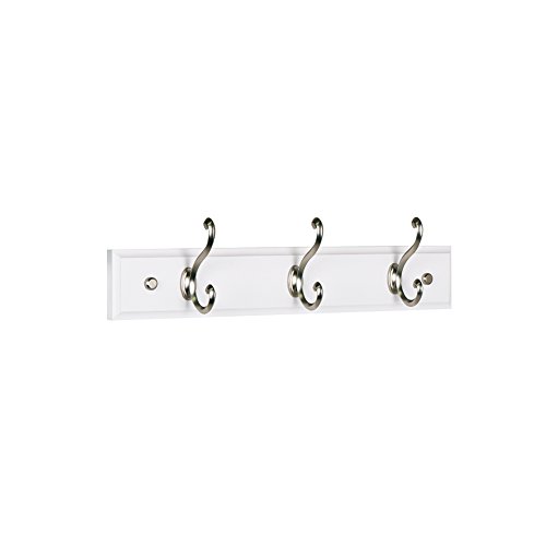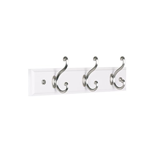 Wall Mounted Coat Rack and Hook Rail - 3 Hooks Classical Scroll Design. White Wood & Satin Nickel
