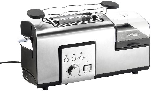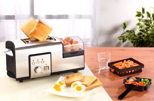 -. Feature : Edelstahl-Multifunktionstoaster mit integrierter Heizplatte zum Braten und Erhitzen und Einsätzen zum Eierkochen und mehr • Integrierte Minipfanne, antihaft-beschichtet (z.B. für 1 Spiegelei)* Kocht bis zu 6 Eier gleichzeitig! • Separate Tasten für Aufwärmen, Auftauen, Stopp • Stromversorgung: 230 V (Kabellänge: 95 cm, Schukostecker) / Viele Funktionen : toasten, Brot aufwärmen/auftauen, kochen, braten, dämpfen, pochieren • Pochiert bis zu 3 Eier gleichzeitig! • Einfachste Reinigung • Maße: 40 x 17 x 19 cm / Optisches Highlight in jeder Küche, auf jedem Frühstückstisch: Edelstahl-Gehäuse mit Bedien-Element und Knöpfen aus Edelstahl • Stufenlos verstellbarer Bräunungsgrad (Drehregler) • Funktions-LEDs / Sie können Toaster und Minipfanne gleichzeitig betreiben • Separater Schalter für die Minipfanne, 2-stufig • Leistung: max. 1250 W (850 W Toaster, 400 W Minipfanne) / Multifunktionstoaster inklusive Krümelschublade, Aufbackgestell für Brötchen, Messbecher mit Eierpiekser, Abdeckhaube für Minipfanne, Wendeheber, Kabelhalterung, Einsätzen zum Eierkochen, Dämpfen, Eier-Pochieren und deutscher Anleitung