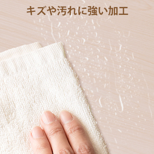 棚板はキズや汚れに強い加工したことで、汚れた場合も汚れを拭き取れ、水にも強いので長く綺麗にお使いいただけます。