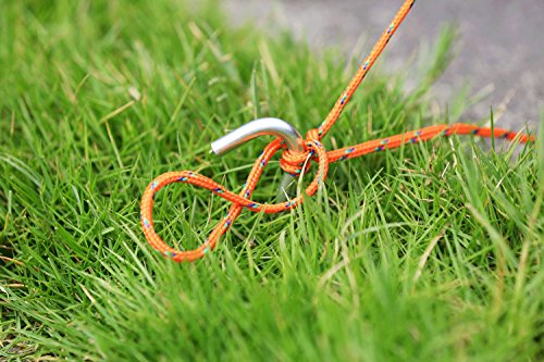 8 tie points,8 Nylon Ropes with adjusters,8 Aluminum Stakes and a dark green carrying bag.