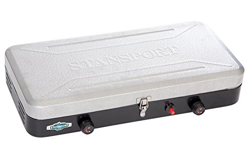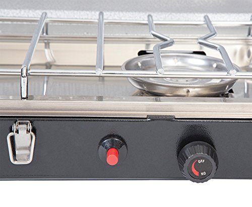 Two-burner, stainless-steel propane camp stove with Piezo igniter for match-free lighting