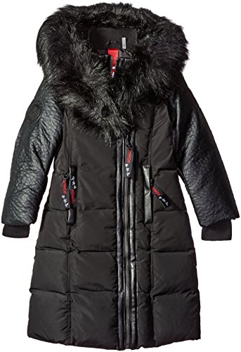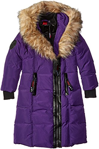 Long bubble coat has storm flap placket, lush faux fur trimmed hood, rib knit cuffs and on seam pockets