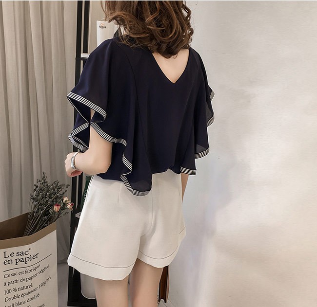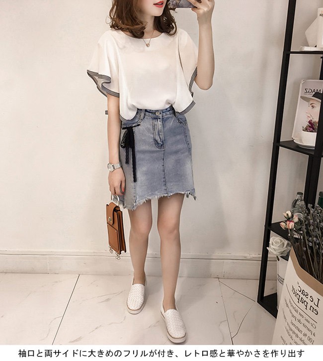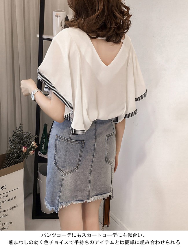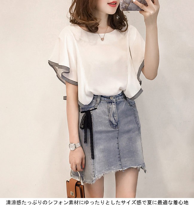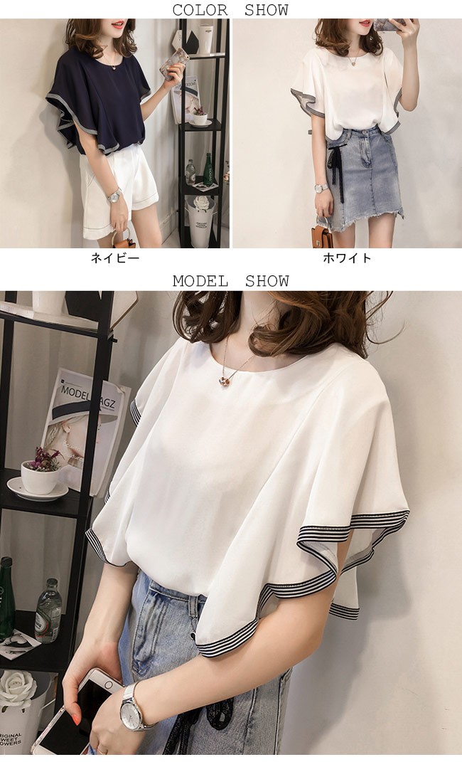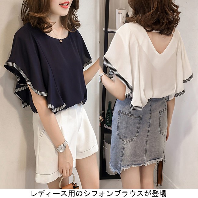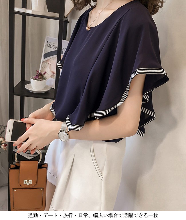 シフォンブラウス 体型カバー レディース 半袖ブラウス フリル ベルスリーブ ブラウス ゆったり トップス 半袖 女性用 夏物 着やせ 通勤レディース用のシフォンブラウスが登場清涼感たっぷりのシフォン素材にゆったりとしたサイズ感で夏に最適な着心地袖口と両サイドに大きめのフリルが付き、レトロ感と華やかさを作り出す前から見ると緩やかな丸襟で後ろから見るとセクシーなVネックのデザインはとても優雅な色気を感じるパンツコーデにもスカートコーデにも似合い、着まわしの効く色チョイスで手持ちのアイテムとは簡単に組み合わせられる通勤・デート・旅行・日常、幅広い場合で活躍できる一枚カラー:ネイビー ホワイト素材 ポリエステルサイズ(cm) M L XL 2XL 3XL 4XLM 肩幅38 着丈60 バスト96L 肩幅39 着丈61 バスト102XL 肩幅41 着丈62 バスト1082XL 肩幅42 着丈63 バスト1143XL 肩幅44 着丈64 バスト1204XL 肩幅45 着丈65 バスト126ご注意:※サイズは平置きサイズです。素人採寸ですので、若干の誤差がございます、ご了承ください。