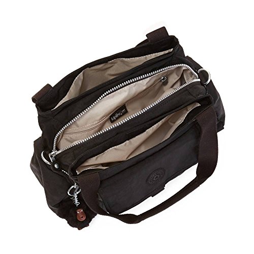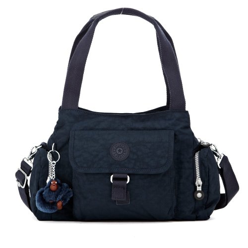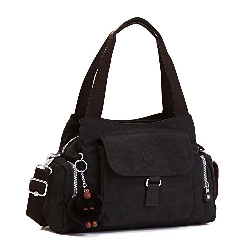 -. Feature : Essentials plus, two extra side pouches for last-minute extras / Toss it over your shoulder or use the strap to transform into cross body functionality / 12.25X8.5X5.75 / Adjustable and removable canvas shoulder strap / Exterior front pocket with velcro closure features a cell phone pocket, 2 pen sleeves and an attached key clasp / Main zipped compartment has roomy zipped pocket against back wall / Side zipped pockets for tossing in last-minute extras / Kipling furry monkey key-ring