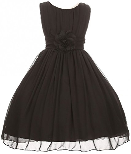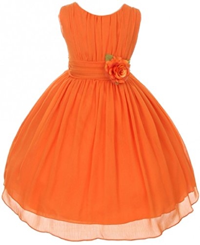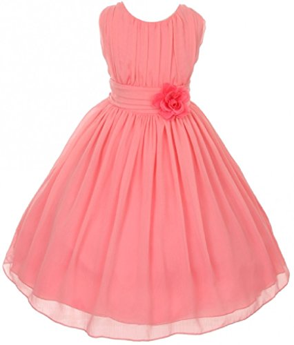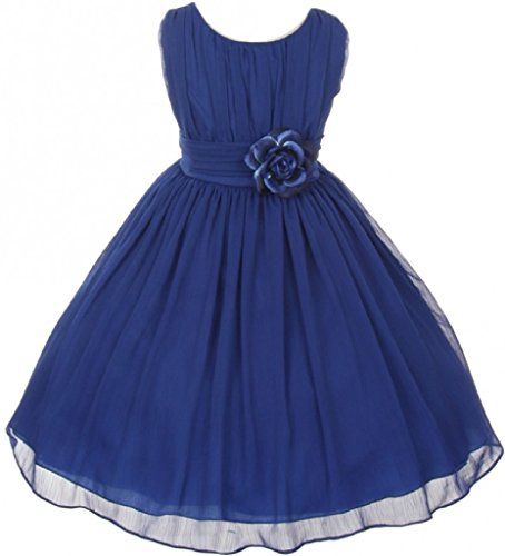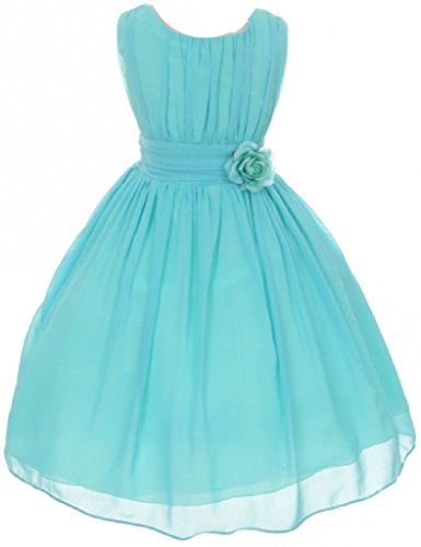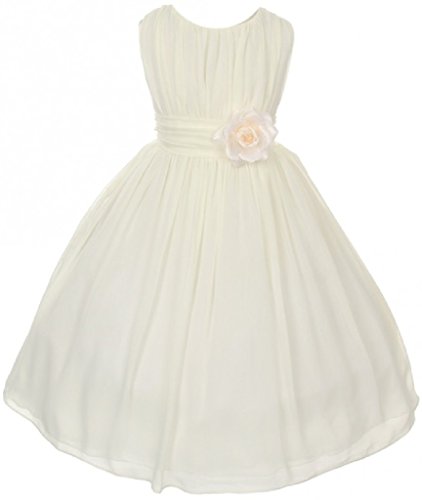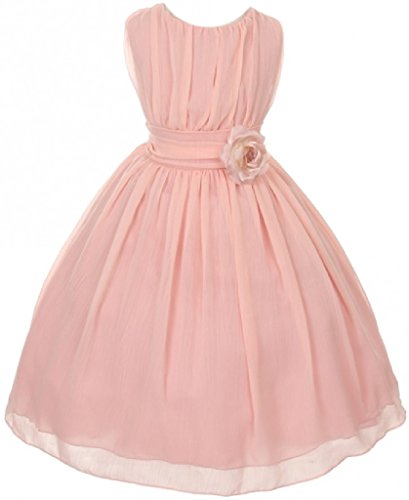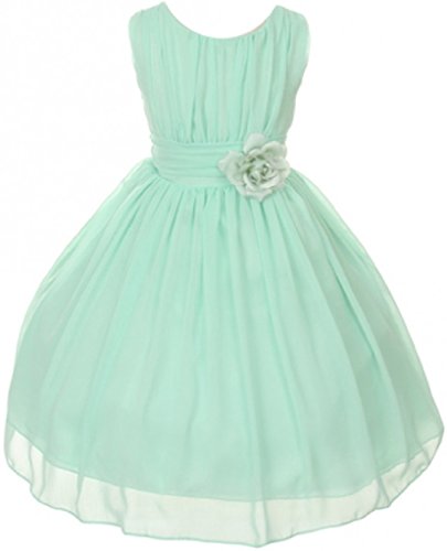Elegant chiffon dress for your special girl. This lovely dress has a ruched bodice with a lovely flower to accent the waist of the dress. Perfect for flower girl, junior bridesmaid, Easter, pageant, graduation and other special occasions.