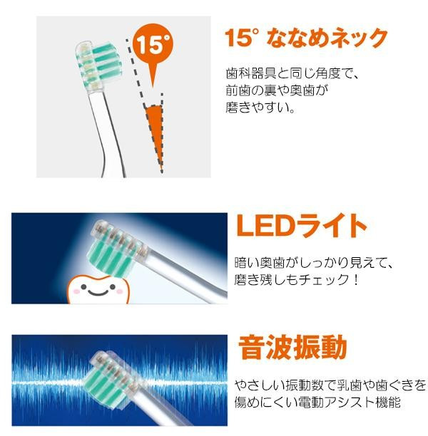 | 仕様 | 対象月齢:6カ月~(歯の本数の目安1本から) 電池:単4形アルカリ乾電池1本(別売) 音波振動:約6000回/分 |