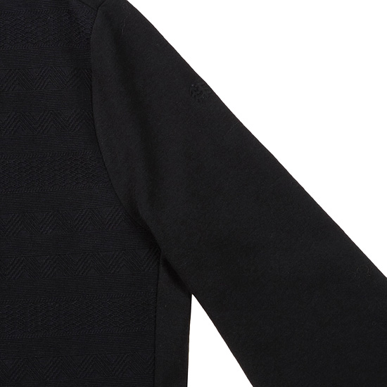 - 소매와 뒷부분에는 동일한 소재감의 플레인한 조직을 사용한 디자인.
