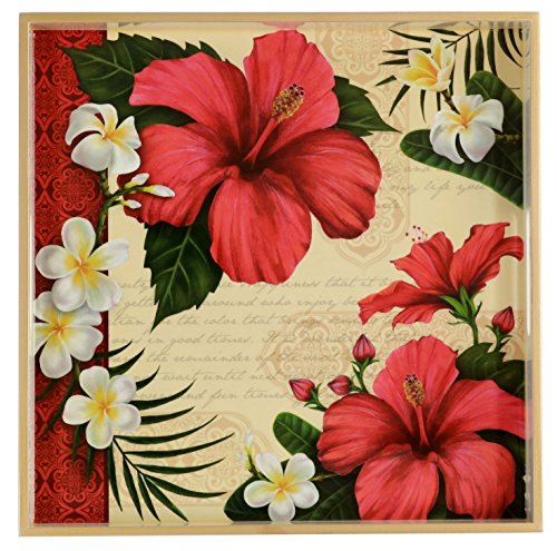 Decorative Square Wood Serving Tray, 12" X 12" *1.5'', Hibiscus Flower Blossom Cream White, White and Red, Holiday, Decorative Floral, Decoupage Netural Home Accent