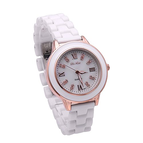 -. Feature : Round Gold Case With Crystals On Dial / Full White Ceramic Adjustable Link Bracelet / Elegant White Background Dial With Gold Hour, Minute And Second Hands / Ladies Fashion Watches / Water Resistant To 99 Feet (30 M): Withstands Rain And Splashes Of Water