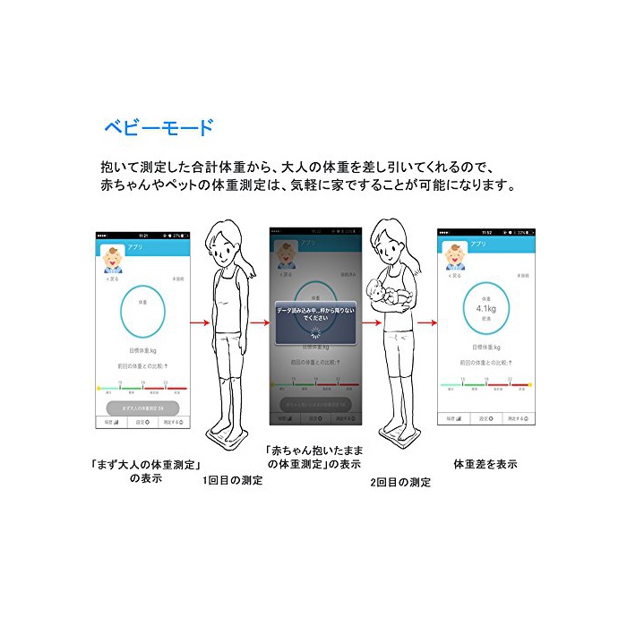 다기능:1byone 체중태 조성계 체지방계는,체중 / BMI / 기초 대사량 / 체지방율 / 추정골량 / 체내 수분율 / 근육량 / 내장 레벨이 측정 성과,레벨의 판정과 이력 데이터의 비교도 가능합니다.최대10명인 유저 프로파일이 자동으로 인식에 옵니다.전용 어플리케이션을 이용하여아카창이나 애완동물의 체중 계산도 가능 입니다.