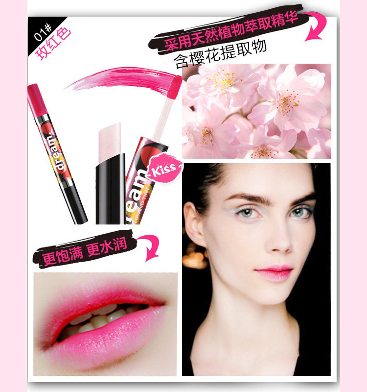 请注意看使用说明:一头珠光唇膏,可以单独使用;一头是染唇液(5种樱花提纯而出),水样液体,轻轻点在最纯内侧,迅速轻抿涂匀即可,自然、活力、性感由此而生,所以才叫“咬唇妆”。