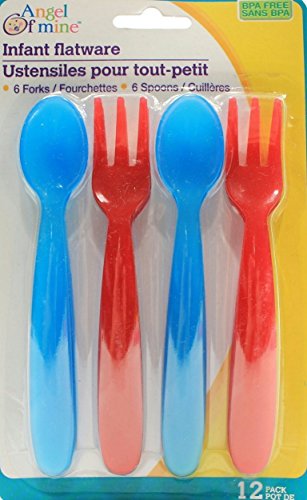 -. Binding : Baby Product -. Color : Red -. EAN : 0678542998606 -. Feature : Pack of 6 sets of blue and red forks and spoons (12 total pieces) / 6 forks and 6 spoons for one low P.R.Ice! / BPA free / Blunt edges for baby's safety / Gentler on sensitive gums and teeth -. IsAdultProduct : 0 -. Label : Angel of Mine -. Manufacturer : Angel of Mine -. MPN : None -. PartNumber : None -. ProductGroup : Baby Product -. ProductTypeName : BABY_PRODUCT -. Publisher : Angel of Mine -. Studio : Angel of Mine -. Title : Blue & Red Angel of Mine Baby Forks & Spoons -. UPC : 678542998606