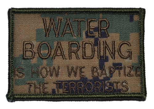 -. Brand : Tactical Gear Junkie -. Feature : 2 inches high by 3 inches wide / Includes velcro-compatible hook backing. Camo patterns on patches will vary. / Great for velcro uniform sleeves, bags and hats / Made in the USA / Visit Tactical Gear Junkie seller page for whole line of patches. -. Label : Tactical Gear Junkie -. Manufacturer : Tactical Gear Junkie -. MPN : WaterBoard -. PartNumber : WaterBoard -. ProductGroup : Home -. ProductTypeName : ART_AND_CRAFT_SUPPLY -. Publisher : Tactical Gear Junkie -. Studio : Tactical Gear Junkie -. Title : Water Boarding is How We Baptize the Terrorists 2x3 Military Patch / Morale Patch - Multiple Colors