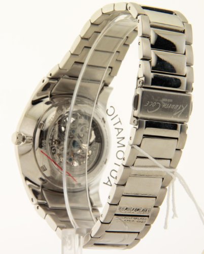 Amazon.com Daring, contemporary, and built to last, the Kenneth Cole New York Men's Automatic Stainless Steel Bracelet Watch pairs the head-turning design of a skeleton dial with durable stainless steel construction. A circular, silver-tone case and fixed bezel complement a rich black dial, complete with luminous black hands and stick hour markers. A scratch-resistant mineral crystal and water resistance to 99 feet (30 meters) guard against wear and tear, while automatic movement lends traditional appeal and ensures reliability and precision. This Kenneth Cole New York original arrives in a white gift box. 0