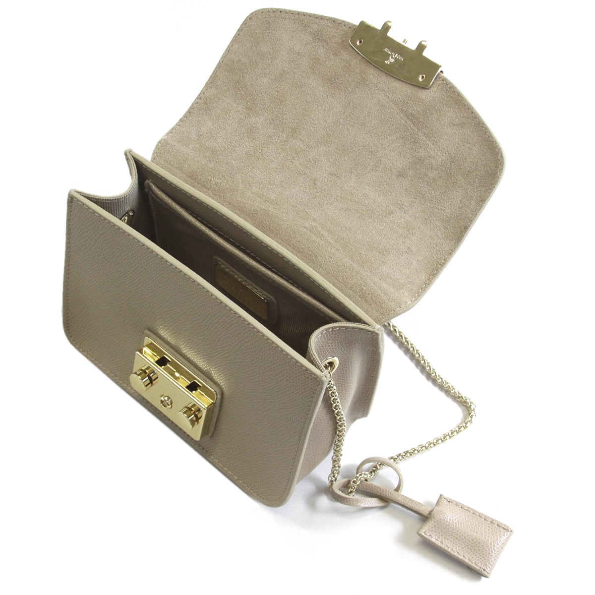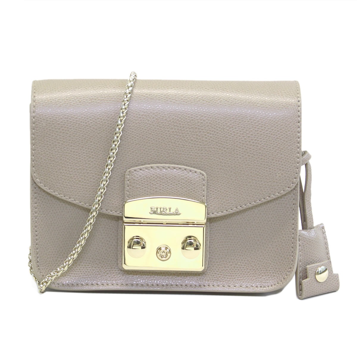 ■商品名 【FURLA】フルラ METROPOLIS 782932 BCU6 ARE ARES NEW CARAMELLO メトロポリス ミニ チェーン ショルダーバッグ クロスボディ ≪2015AW≫■カラー NEW CARAMELLO ベージュ■金具 ゴールド■開閉方法 留め金具開閉(ロック鍵付)■素材 アレスラミネーテドレザー(牛床革)■サイズ H:約12cm×W:約16.5cm×D:約8cm 重さ:約408g ショルダー長さ:約125cm(調節不可・着脱可能) レザーカバー付キー(鍵):全長13.5cm(着脱可能) 底鋲×4■ポケット 内側:オープンポケット×1 ■付属品 専用保存布袋■注意 ※当商品は並行輸入にて海外より仕入れております為、希に外箱にへこみや破れなどのダメージがある場合がございます。予めご了承くださいませ。※レザー商品、パテントレザー商品共に商品加工の際に付く小さい黒点やシワ、細かい傷等が見られる場合がございます。こちらは天然素材の特性であり、不良品ではございません為、ご購入後の返品をお受けすることができません。予めご了承くださいませ。