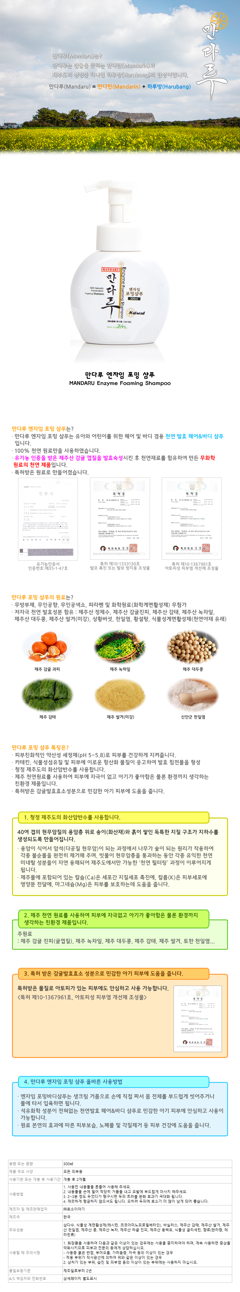 - 주요성분삼다수, 식물성 계면활성제(레시틴, 코코아미노프로필베타인), 바실러스, 제주산 감태, 제주산 쌀겨, 제주산 천일염, 제주산 콩, 제주산 녹차, 제주산 하귤 진피, 제주산 동백유, 식물성 글리세린, 향료(한라향, 테라핀류)
