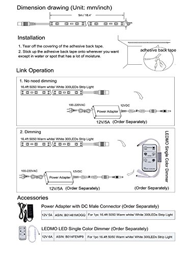 - Need to feed by a 12V/5A (60Watt) Power adapter, Dimmable with LED Single Color Dimmer