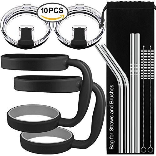 10 Pieces 20oz Tumbler Holders Handles + Tumbler Lids + Stainless Steel Straws + Cleaning Brushes, SourceTon Accessories Kit for Yeti Rambler Rtic Ozark Trail Berg SIC, Lids & Handles in Black