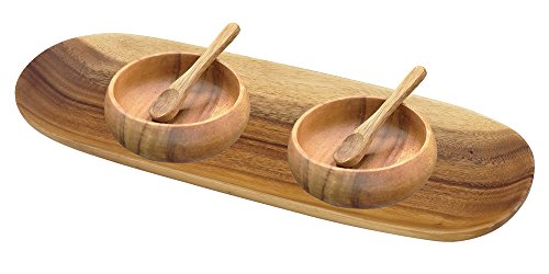 Studio : Pacific Merchants Acaciaware Publisher : Pacific Merchants Acaciaware Product Description Pacific Merchants Acaciaware natural hardwood appetizer trays, dipping bowls and nut bowls are an attractive yet functional addition to your serveware for entertaining. For example, this appetizer tray serving set can be used for your dining table entertaining. Or use as a cheese serving tray, cheese board or for crudite platter ideas. Use only genuine Acaciaware serveware as beautiful serving dishes or use a an appetizer plate for dinner parties, formal or casual dining, family gatherings and entertaining friends.Perfect as a hostess gift, wedding gift idea or housewarming gift. Genuine Acaciaware is durable beyond the wood's inherent natural wood beauty. The tight grain of acacia wood along with a food-safe protective finish makes this tray resistant to penetration by liquids, and it will not stain or pick up odors. Unlike bamboo bowls or Acaciaware imitators which are made from glued or laminated small pieces of wood, all our acaciawood kitchenware is hand carved from one solid piece of natural acacia hardwood. Acaciaware is kid friendly because it is made from natural wood, completely food-safe and has no sharp corners or splinters. If for some reason your acacia wood appetizer tray and serving plate ever appears dry, treat it with 100% pure mineral oil and the grain will be restored to its original beautiful condition. Acaciaware comes in a various shapes and sizes. Take care of your Acaciaware natural acacia wood and it will last you for years of enjoyment. 0