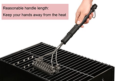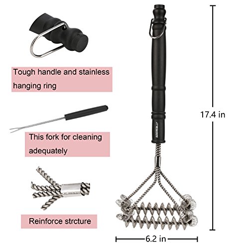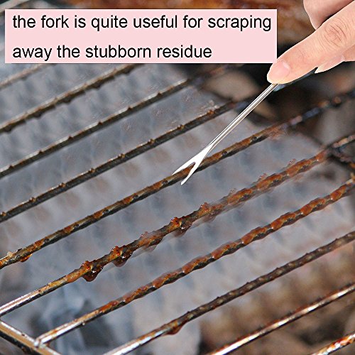 - STIFF BRUSH &COMFORTABLE DESIGN- 100% rust resistant stainless steel grill cleaner. Keep your hands away from the heat with the reasonable long handle length design and clean the grill grates effortlessly. A fork is provided for free for cleaning adequately.