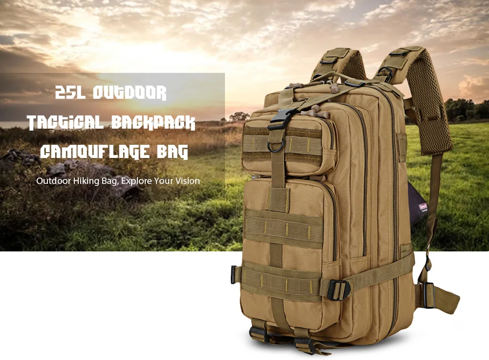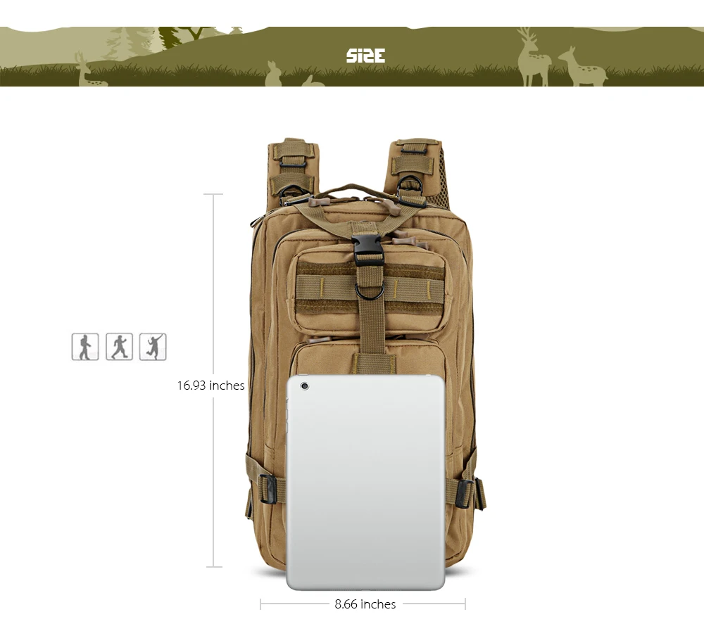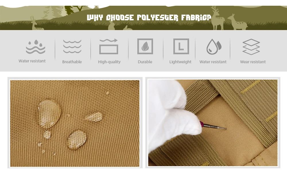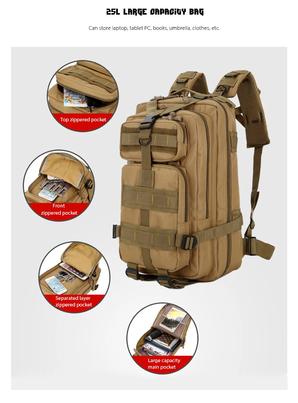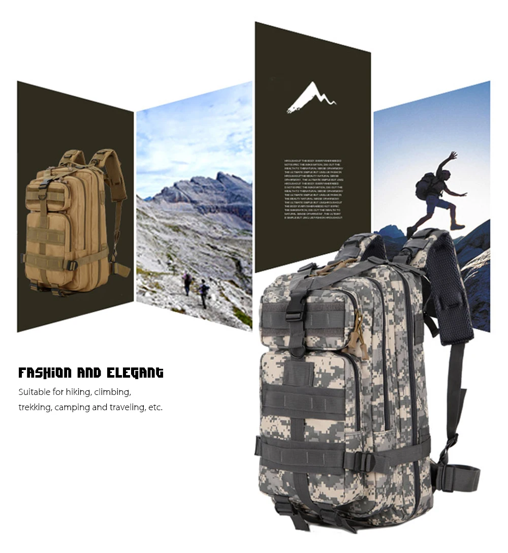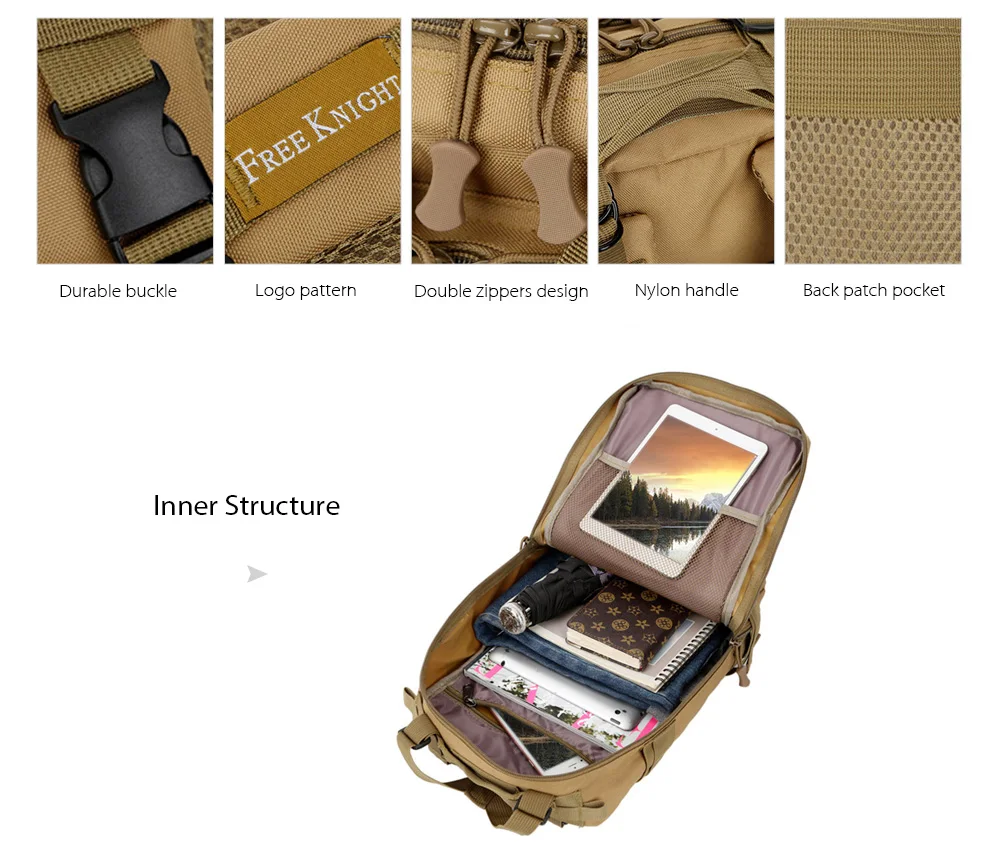 - The front」ャ top」ャ two sides and bottom of the bag are military regulation molle fast hanging system」ャ can be used to bind the fixed module attachments such as sleeping bag」ャ small tent」ャ flashlight set and various outdoor tools」ャ convenient and durable