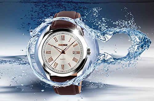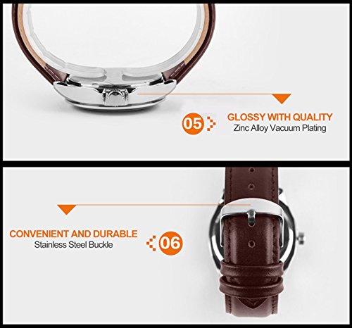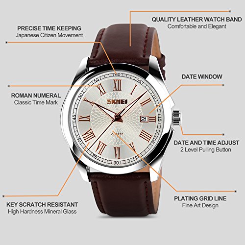 Highlights: • Original Japanese CITIZEN Quartz Movement: provide precise and accurate time keeping • Key Scratch Resistant Watch Face • Roman Number Time Mark • Rose Gold Plating Grid Line Fine Art Dial • Comfortable Leather Band Strap • Calendar Date Window • Stainless Steel Durable Waterproof Case Cover • 98FT / 30M Water Resistant - 3ATM: Daily Use Waterproof, Hand Wash, Rain Day, Sweating, NO Problem. (Please DONOT PULL OUT the button under water) • Classic Business Casual Dress Watch Design. Combines quality, leading edge fashion, and value. Features • Roman Number Time Mark • Key Scratch Resistant Watch Face • Calendar Date Window • 98FT / 30M Waterproof • Leather Band Strap • Plating Grid Line Fine Art Dial Material: • Case Material: Stainless Steel • Band Material: Leather • Mirror Surface: German High Hardness Mineral Glass (Key Scratch Resistant) Specification: • Dial Color: Rose Gold • Dial Case Diameter: 1.57 inch / 4 cm • Dial Case Thickness: 0.39 inch / 1 cm • Band Color: Brown • Band Width: 0.83 inch / 2.1 cm • Band Length: 9.8 inch / 25 cm. • Band Clasp Type: Double Locking Fold Over Clasp • Watch Weight: 2.82 oz / 80 g **NOTE**: • Please DONOT PULL OUT the Button Underwater. Use in extreme Hot or Cold temperature will damage the leather band and shorter watch life. • If mist or droplets found inside watch surface, please contact manufacturer immediately. • Clean the strap by a soft cloth on regular bases is highly recommended. • Too much water contact will damage the leather band and shorter watch life. What Is In The Package: • Aposon Leather Band Business Casual Dress Watch x 1Feature