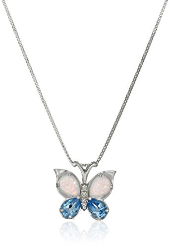 -. Binding : Jewelry -. Brand : Amazon Collection -. Color : multi-colored -. Department : womens -. Feature : Beautifully crafted Light Blue Topaz, created Opal and diamond accented pendant finished in high polish sterling silver / Excellent for all ages and any occasion / Gemstones may have been treated to improve their appearance or durability and may require special care. / All our diamond suppliers confirm that they comply with the Kimberley Process to ensure that their diamonds are conflict free. / Imported -. Label : Amazon Curated Collection -. Manufacturer : Amazon Curated Collection -. Model : SN4561MSPC18 -. MPN : SN4561MSPC18 -. PartNumber : SN4561MSPC18 -. ProductGroup : Jewelry -. ProductTypeName : FINENECKLACEBRACELETANKLET -. Publisher : Amazon Curated Collection -. Studio : Amazon Curated Collection -. Title : Sterling Silver Swiss Blue Topaz and Created Opal Butterfly Pendant Necklace, 18"
