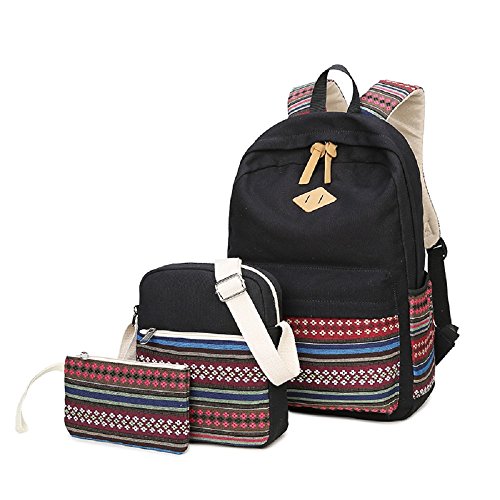 Ethnic Flower Pattern Canvas School Bag Set, Backpack + Messenger Bag + Pencil Case, Zipper College Laptop Backpacks for Teenagers Girls Kids - Red