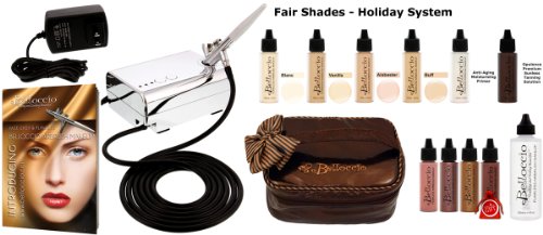 -. Feature : Belloccio® Cosmetic Makeup Airbrush & Compressor System with 1 Year Free Replacement Warranty / Belloccio® FAIR Shade Airbrush Makeup Foundation Set with 4 colors to assure a Perfect Match. / Anti-Aging Moisturizing Primer (1/4 oz) With Radiant Bronzer, Blush & Highlighter bottles. / Free: Belloccio's® Limited Edition Cosmetic Carry Bag & bottle of Blush / User Guide Manual - Detailed steps for getting the best results when using the Belloccio System.