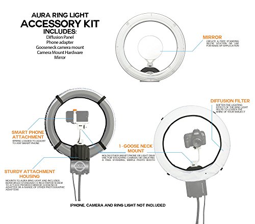 Aura Ring Light Accessory Kit - 5 Piece Accessory Kit to expand the capabilities of your Aura Ringlight. Includes Diffusion Screen, Gooseneck Camera Adapter, Smart Phone Adapter and Mirror