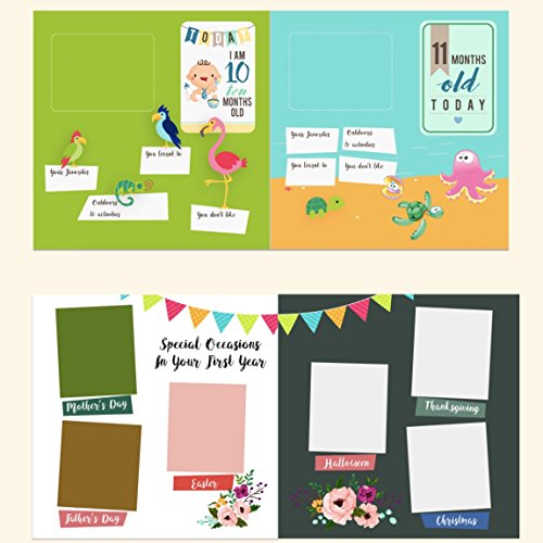 ✤ Thoughtful content without making it too overwhelming which means you don't spend too much time writing down a lot of text. 46 Easy to fill & CONTENT RICH pages to capture milestones. Also includes illustrated FAMILY TREE and space for a FAMILY PHOTO. Contains everything from PREGNANCY to separate pages for each month of the first year, and goes up to the first 5 YEARS! Book Size in Inches - 9.5" by 9.5" by 1"