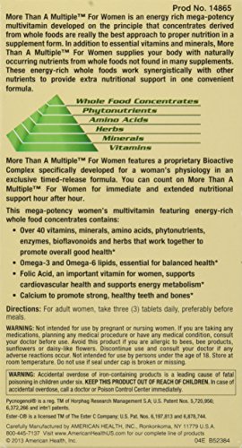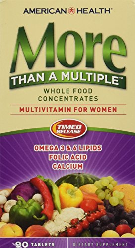 -. Binding : Health and Beauty -. Brand : American Health -. Department : Health and Beauty>Health and Wellness -. EAN : 0076630148658 -. Feature : An energy rich mega-potency multivitamin developed on the principle that concentrates derived from whole foods are really the best approach to proper nutrition in a supplement form / In addition to essential vitamins and minerals, more than a multiple for women supplies your body with naturally occurring nutrients from whole foods, not found in many supplements / These energy-rich whole foods work synergistically with other nutrients to provide extra nutritional support in one convenient formula / An energy rich mega-potency multivitamin developed on the principle that concentrates derived from whole foods are really the best approach to proper nutrition in a supplement form / In addition to essential vitamins and minerals, more than a multiple for women supplies your body with naturally occurring nutrients from whole foods, not found in many supplements / These energy-rich whole foods work synergistically with other nutrients to provide extra nutritional support in one convenient formula -. IsAdultProduct : 0 -. Label : American Health -. LegalDisclaimer : These statements have not been evaluated by the Food & Drug Administration. This products is not intended to diagnose, cure, mitigate, treat, or prevent any disease. -. Manufacturer : American Health -. Model : 600270 -. MPN : AM0190 -. NumberOfItems : 1 -. PackageQuantity : 1 -. PartNumber : AM0190 -. ProductGroup : Health and Beauty -. ProductTypeName : HEALTH_PERSONAL_CARE -. PublicationDate : 2014-04-11 -. Publisher : American Health -. ReleaseDate : 2014-04-08 -. Size : 90 -. Studio : American Health -. Title : American Health More Than a Multiple Multivitamin Supplement for Women, 90 Count -. UPC : 076630148658