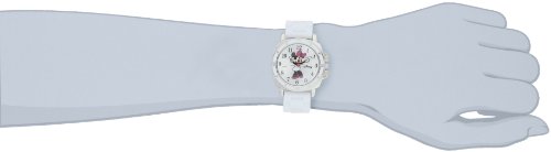 Silver-tone watch featuring white strap and Minnie Mouse motif on sunray dial